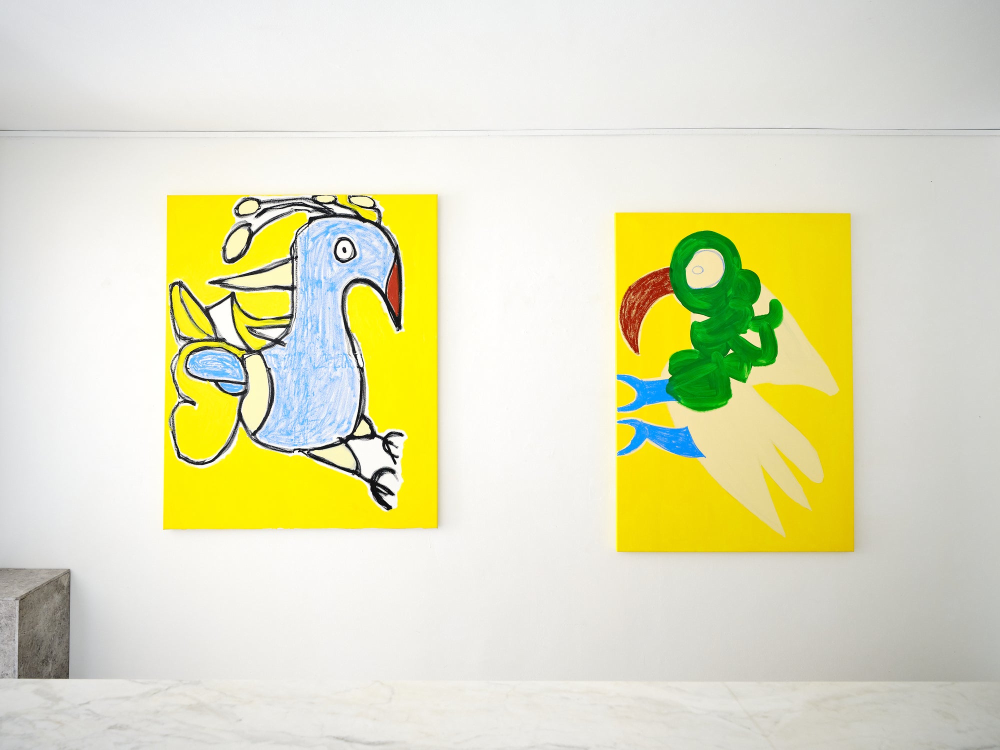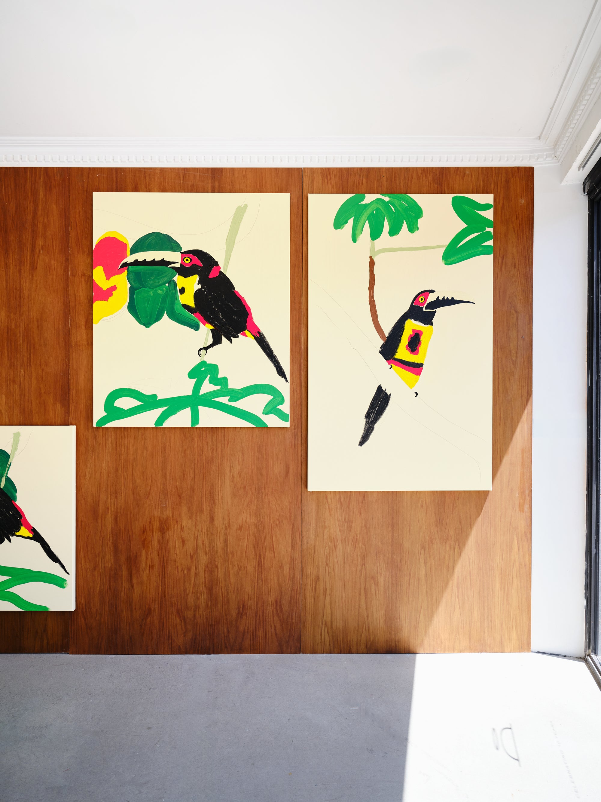The exhibition draws inspiration from a colonial tapestry housed in Bogotá’s Museo Arqueológico, where birds rendered through Spanish eyes appear as symbols of consumption and erasure. Imagined as drinking the sun, these birds allude to the theft of Colombia’s gold, once understood by Indigenous peoples as the sweat of the gods, or the sun itself.