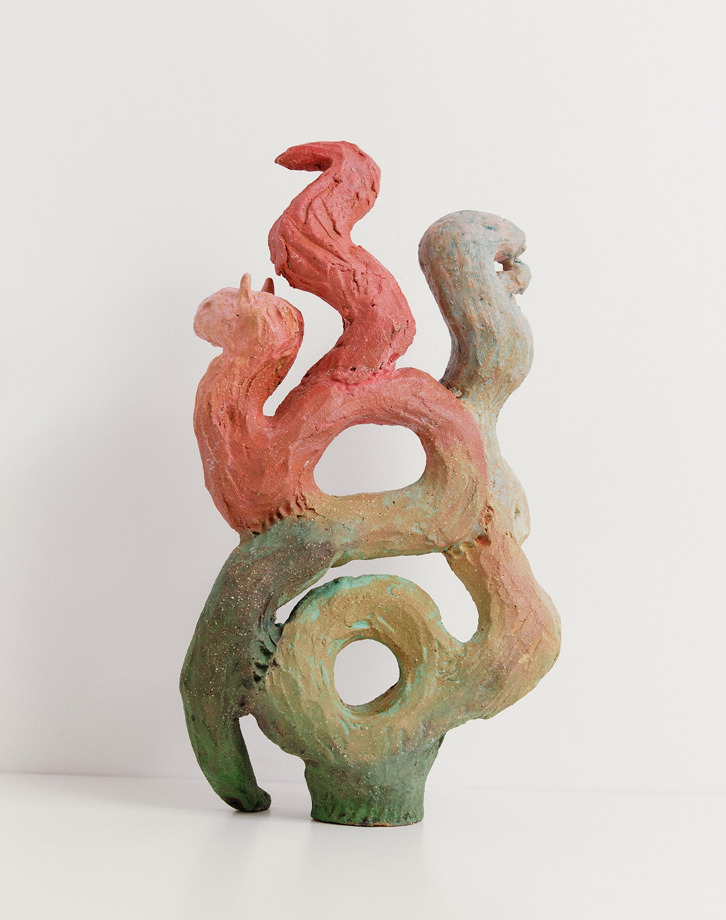 Developed after six months living in the Netherlands, these works reveal layered colour and raw clay built up across multiple firings.
