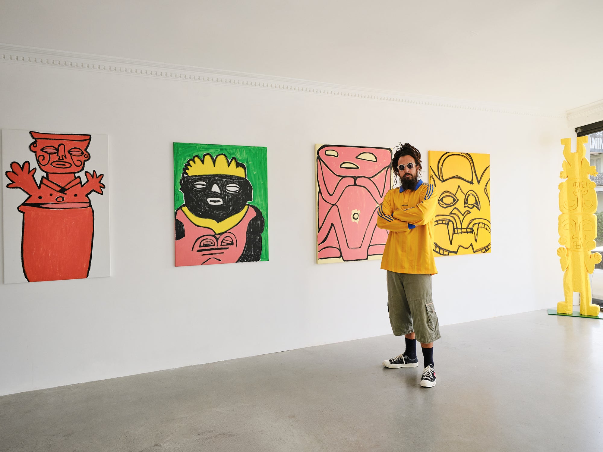 Searle’s practice frequently employs figurative repetition, with meaning shifting in response to historical and personal contexts. His major projects - including Wall of Gold (2023), Stolen Gold (2023–24), and Museo del Oro Robado (Museum of Stolen Gold) (2024) = engage with Pre-Columbian artefacts, exploring their presence in museum collections as a way to understand his own diasporic history.