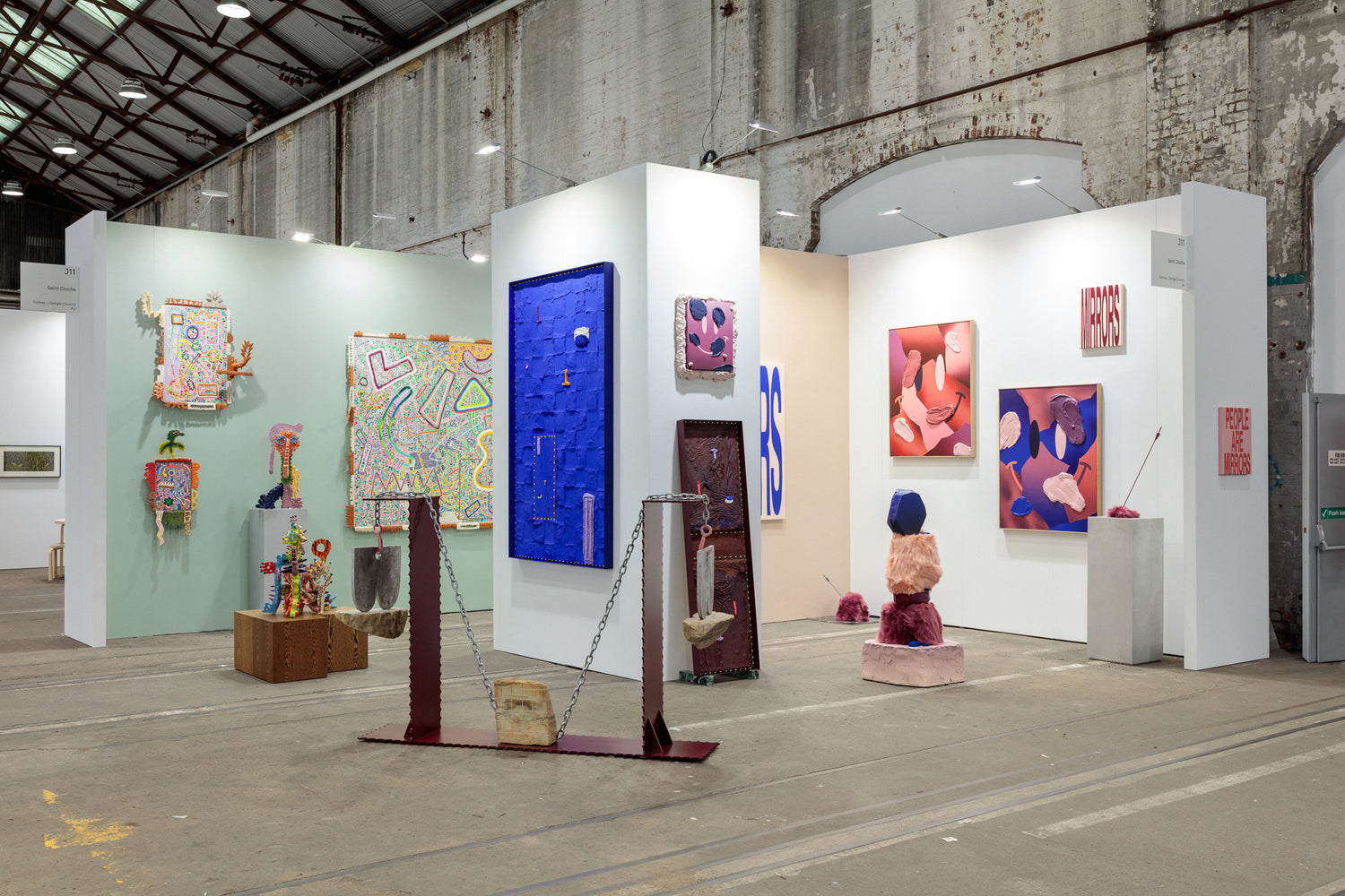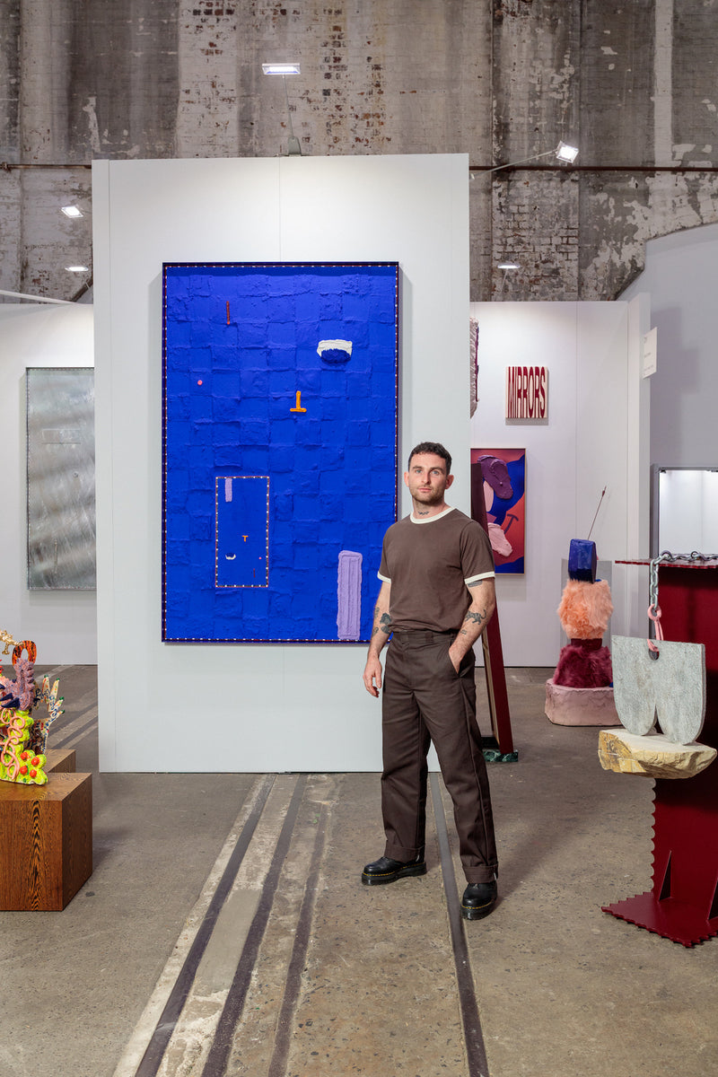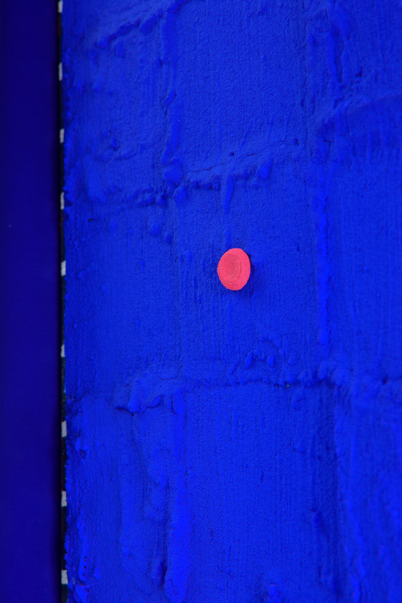 acrylic paint, sand, powder coated steel, plywood, canvas