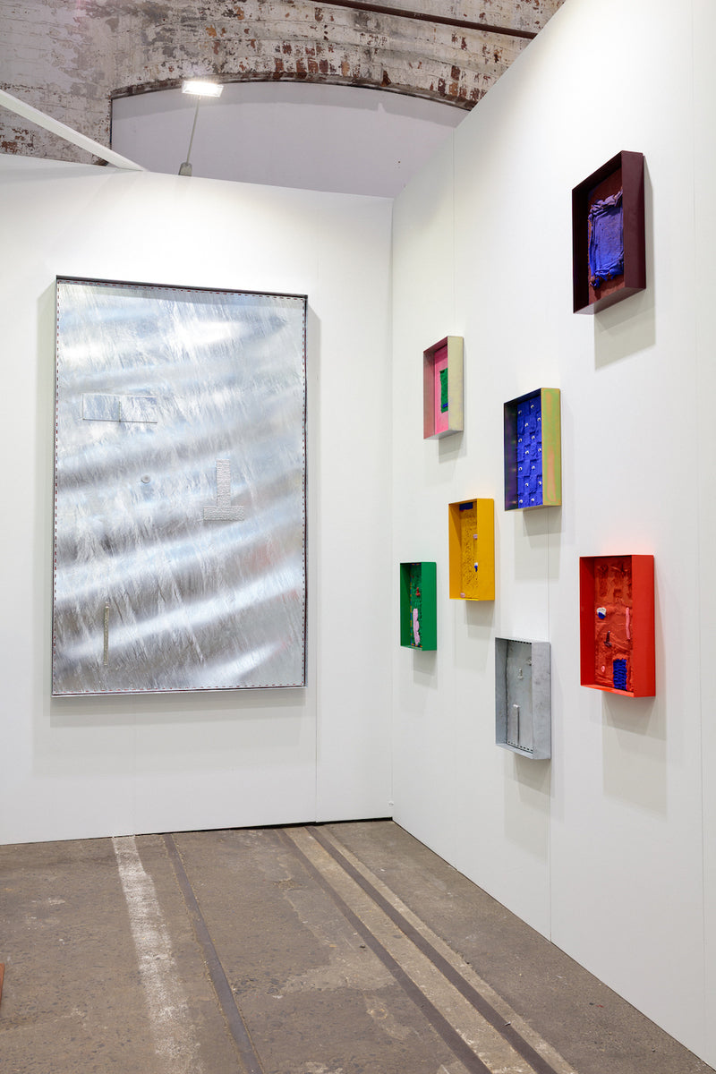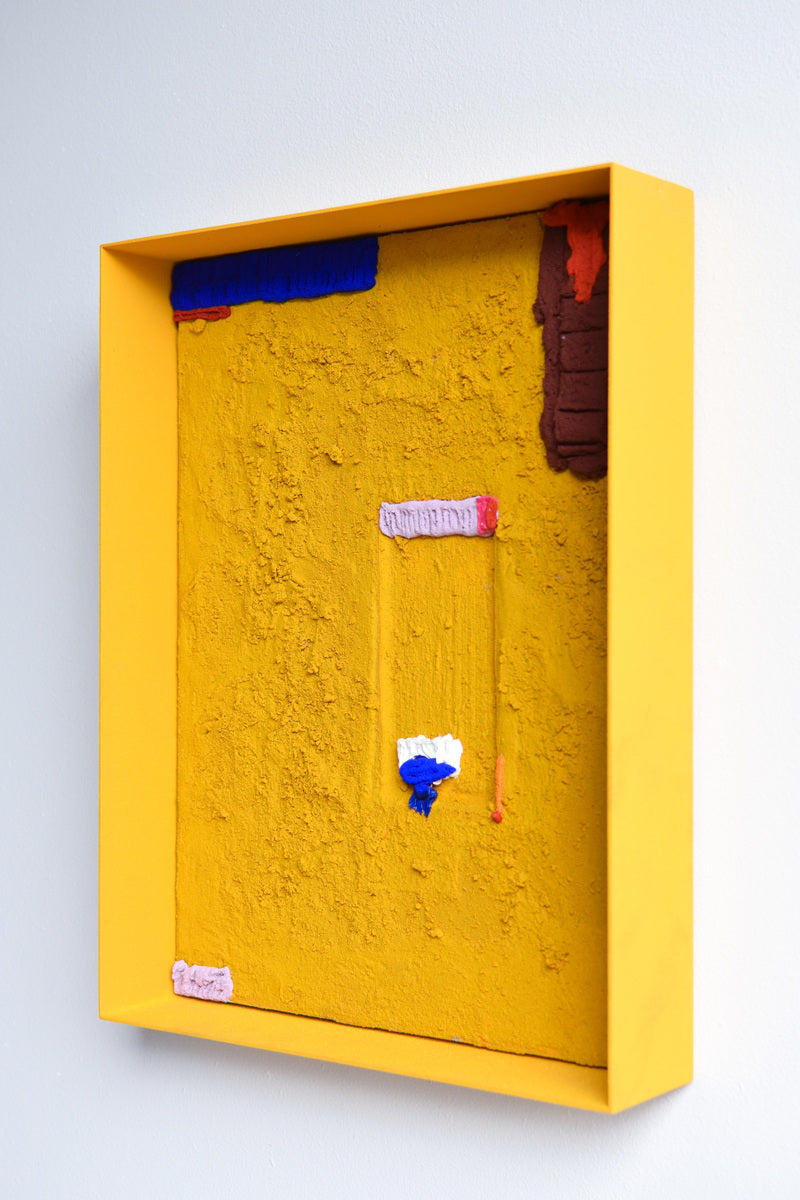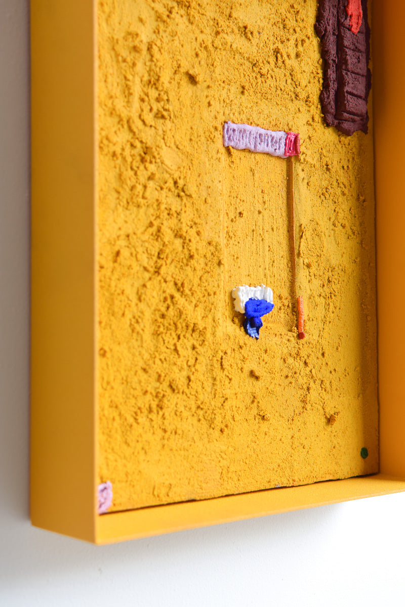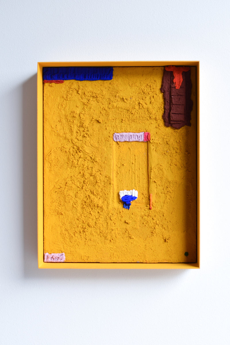 acrylic paint, sand, powder coated steel, plywood